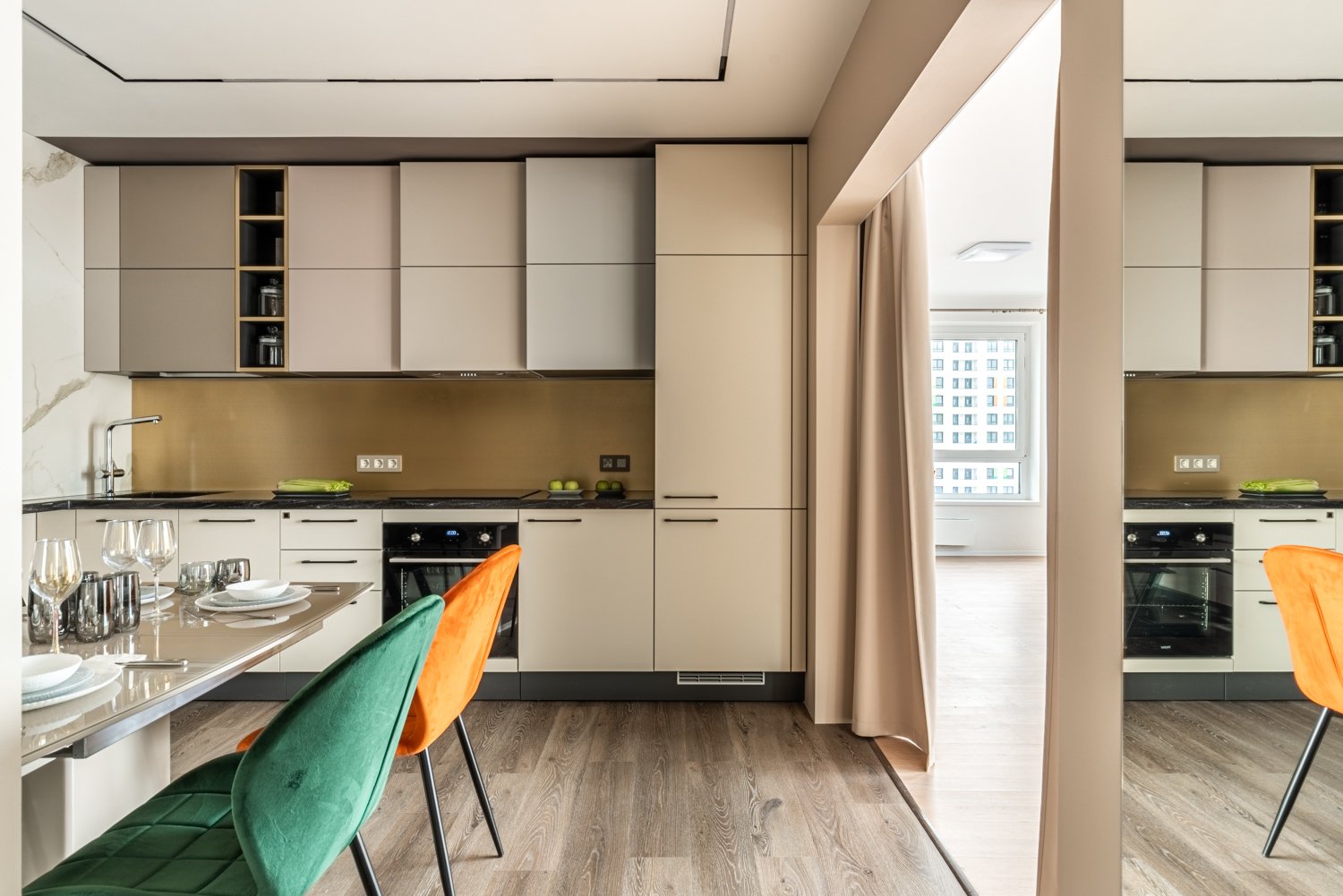 Перед дизайнером Татьяной Кононовой-Левиной стояла задача сделать так, чтобы на кухне было удобно жить, готовить и творить всем жителям квартиры, но и чтобы Данил смог пользоваться удобствами, такими элементарными, как сделать самому себе чай, набрать воды, сделать себе бутерброд. И задача удалась!